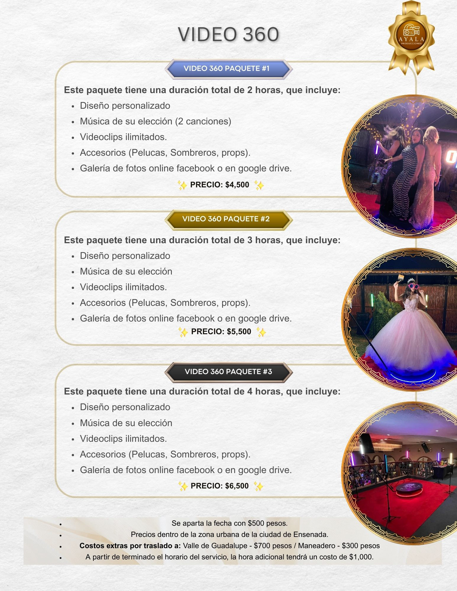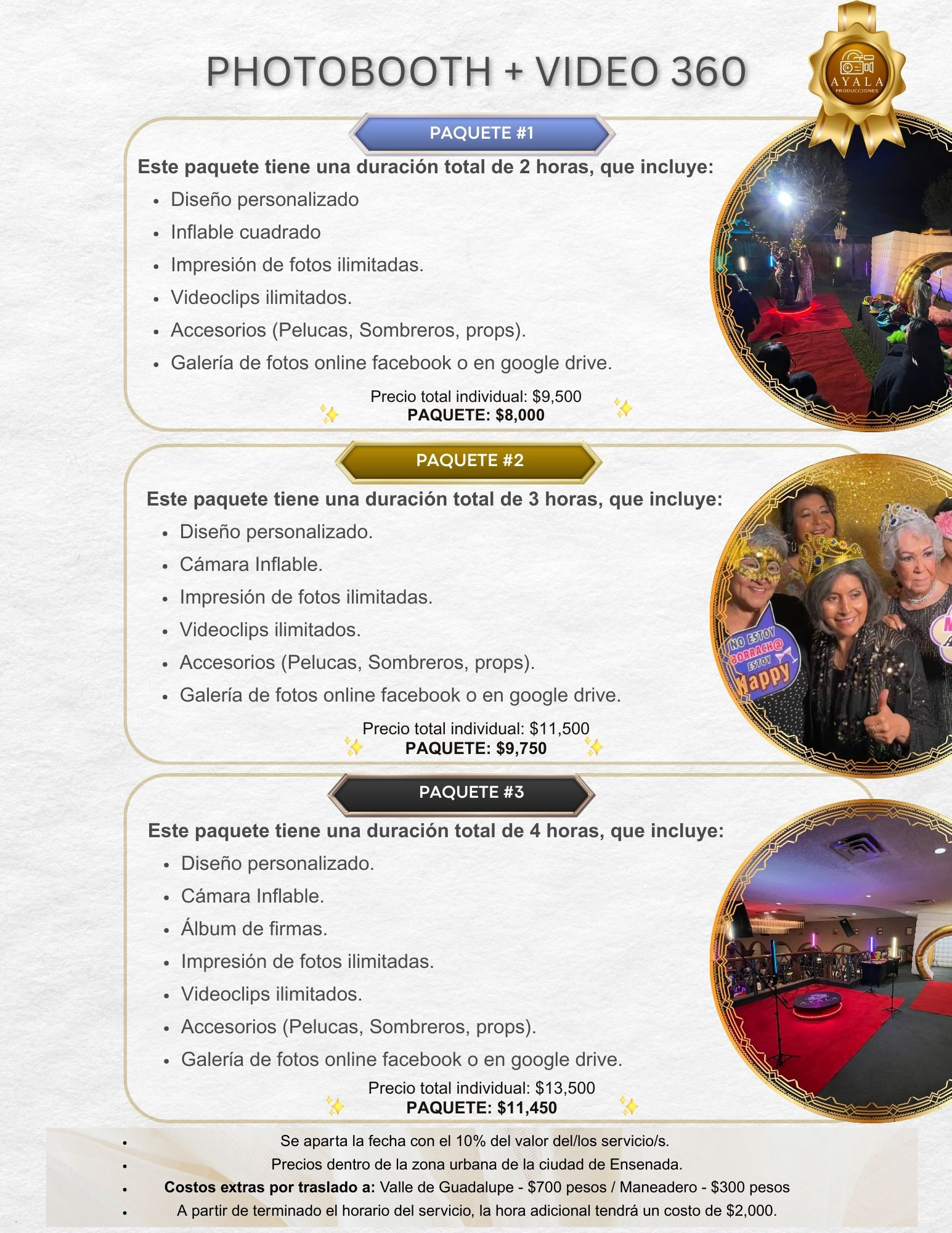 Nuestro Video 360 captura videos en movimiento con música, cámara giratoria y edición dinámica para que tú y tus invitados se vean increíbles. Perfecto para compartir en Instagram, TikTok y más.